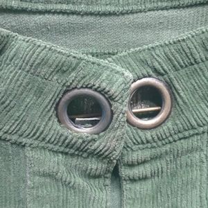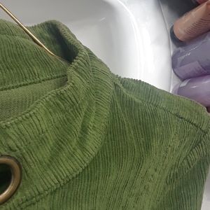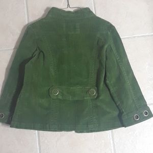 Hunter green corduroy cropped sleeve jacket w/ decor on jacket face and back of arm sleeve~ pocket w/zippers near midsection~ cropped neck~ two light stains that I was surprised to see because this jacket hasnt been worn anywhere. Appears there is some loose material near decor clamp.Well its been sitting ,but make me an offer if you want to help me haul it out of my closet.