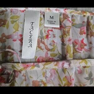 This is a Tacera blouse top in size M with a floral pattern and ruffled bell sleeves. It has a round neckline and a pullover closure. The blouse is made of polyester fabric and features a layered bell sleeve style. It is machine washable and suitable for casual or business occasions. The top has a relaxed fit and is adorned with ruffle accents, perfect for a stylish and feminine look.