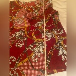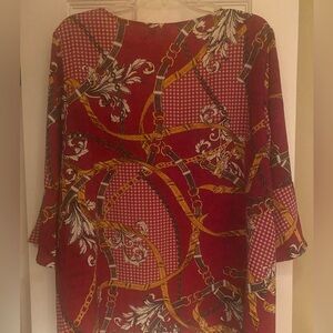 Stylish tunic with bold red and gold pattern. Features intricate chain and floral design. Perfect for a chic look. V-neck with 3/4 sleeves that are flared at the bottom. Measures 29” from shoulder to hem. Back is slightly longer than front. Pit to pit measures 25”. Sleeve length is 17” from shoulder seam to bottom of sleeve.