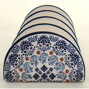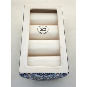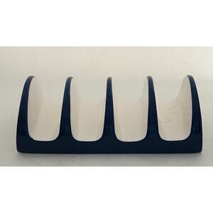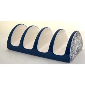 Taco holder or desk organizer by Bico. This is ceramic with four sections. It is blue and white design. It is about 8" long, 4" wide and 2.5" high on the end. There is a small rough spot on the side bottom. See last picture.