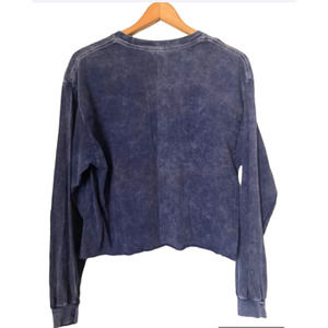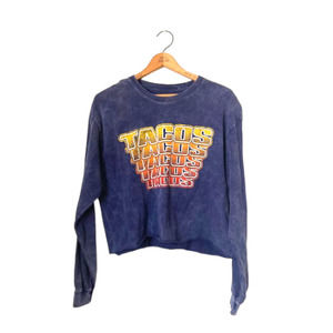 Washed up blue long-sleeve top with a TACOS print in oranges & yellow. Solid blue back.