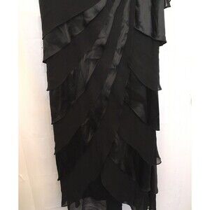 Look absolutely stunning in this Tadashi Shoji Black Sleeveless Tiered Gown. Alternating contrasting silk and silk chiffon ruffles cascade down skirt.