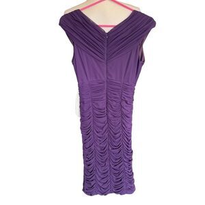 Elevate your evening wear with this stunning Tadashi Shoji dress. The pleated and ruched details create a sophisticated and elegant silhouette that is perfect for formal occasions such as cocktail parties and proms. The knee-length bodycon sheath dress features a V-neckline and a set-in sleeve, with a zip closure for a seamless fit.