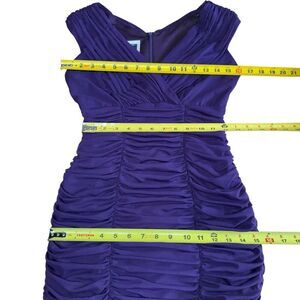Crafted from a blend of nylon and spandex, this dress is comfortable and flattering for petites. The solid purple color adds a touch of glamour and sophistication, making it a must-have for any wardrobe. This dress is dry clean only and can be worn in any season.