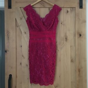 Tadashi Shoji figure-hugging embroidered lace dress in fuchsia. Size 6. Features eyelash-finished lace trim at the neckline, sleeves, and hem. Hidden back zipper. Perfect dress for that special occasion. Pit to pit measurement is approximately 18 inches. Waist measurement is approximately 14.25 inches. Length is approximately 37.75 inches.