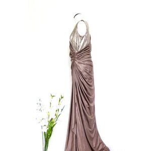 Description: This is a genuine Tadashi Shoji Gown Dress. One of the models is wearing a different color dress but is the same style. No tears, marks, stains, flaws or defects. The dress features round neckline, full zip closure, sleeveless, sequin detail with draped and ruched design, side slit, floor length silhouette, soft polyester blend fabric, has stretch, dry clean, imported. Retail $375