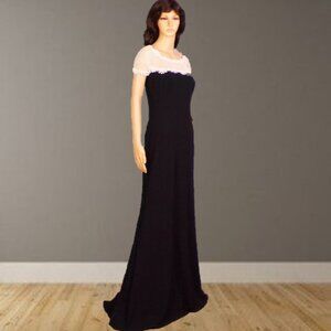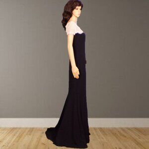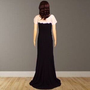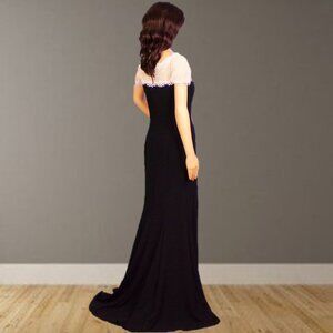 THIS SERENELY ELEGANT BLACK AND WHITE SHORT-SLEEVE BORDERLINE-FORMAL FULL-LENGTH SPECIAL-EVENT/OCCASION GOWN BY TADASHI SHOJI, SIZE S, is gently pre-owned, in near-perfect condition, free of defects, damage, or signs of wear. In classic mermaid-gown style, it fits closely to about the knees and flares widely below that. The sleeves and upper bodice are white lace (picture #9), the balance solid black. It closes with a clasp and zipper in back and is fully lined (except the white lace) in lustrous black 100% polyester fabric. The outer fabric is a blend of polyester (95%) and spandex (5%), the "contrast" (I believe that's the white lace) a blend of cotton (60%) and nylon (40%). Hand wash cold and line dry are recommended. The stated size is S, but prospective buyers are encouraged to compare the measurements with those of a dress that they know fits well prior to purchase. Measurements are: chest, pit to pit 16", stretches to about 17"; waist 14", stretches to about 15.5"; hips 17.5", stretches to about 19"; hemline 52.25"; shoulder about 16.5" (approximate because there's no seam between shoulder and sleeve); sleeve about 6"; length (in back, neckline to hem) 64.5".