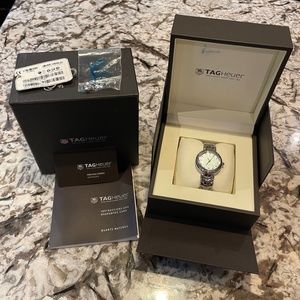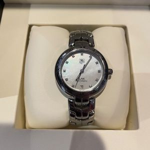 This is a preowned Tag Heuer Link Diamond automatic women's watch. The model number is WAT2315.BA0956. I purchased this for myself brand new a few years ago, and have worn it almost every work day. I absolutely love this watch, but have recently purchased another one, so this one is not getting the wear that it deserves anymore. As you can see in the pictures, I still have the original box, card, extra links, tag, etc. The watch keeps time and has been treated extremely well by me. The only exposure to water has been while washing my hands. It has never been worn swimming, in the shower or anything like that. It's in great condition and ready for its new owner!