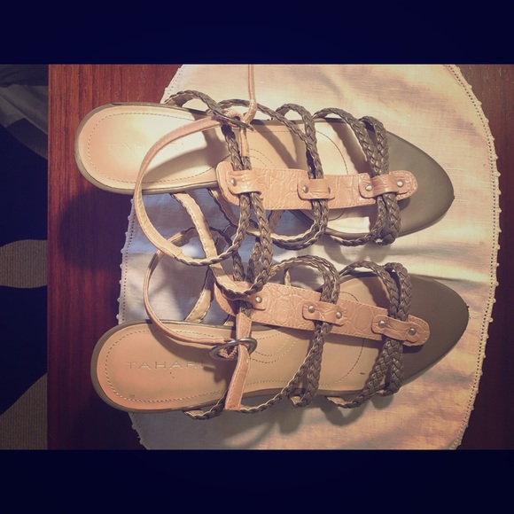 Gray and beige leather strappy sandals. Very comfortable since the heel isn't too high. Very minimal wear and in near excellent condition.
