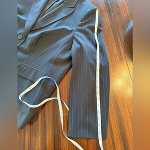 Jacket is lined, 2 button, has a notch lapel collar and 2 faux front pockets.
