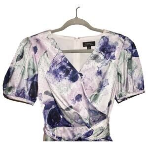 Step into elegance with this TAHARI ASL Floral Print Puff Sleeve Faux Wrap Dress. Featuring a stunning floral pattern in soft shades of purple and green, this dress offers a feminine and sophisticated look. The faux wrap design and tie waist create a flattering silhouette, while the puff sleeves add a stylish touch of volume. Perfect for special occasions or a chic day out, this dress combines comfort and style effortlessly. Pair it with heels or flats to complete your polished ensemble. Lined; Zips in back