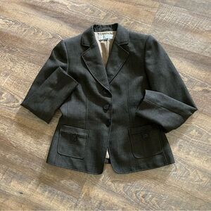 A dark blend of brown/black create a subtle and professional allover print on this TAHARI Arthur S. Levine blazer. Three front buttons + small functional front pockets. Size 6 petite. Please see photo section for approximate flat measurements. Material: 100% polyester.