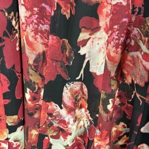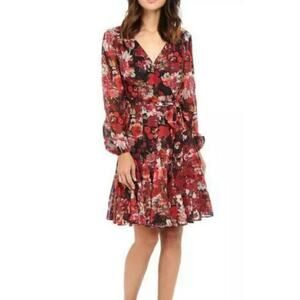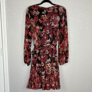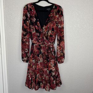 This is a Tahari ASL floral dress in size 18 with a multicolor pattern. The knee-length dress features long sheer sleeves and a surplice V-neckline. It is made of polyester chiffon fabric with a fit & flare style. The dress is suitable for various occasions such as travel, weddings, parties, and workwear. It has a poppy and flower theme in black, burgundy, orange and red. It has sheer long sleeves, is lined, collarless and belted