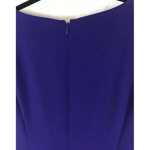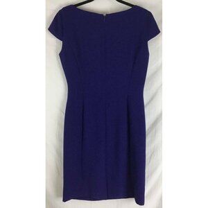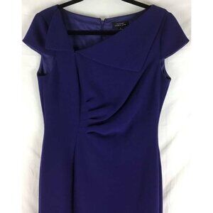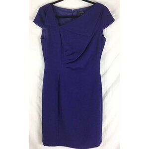 A women's size small dress from TAHARI Arthur Levine. The dress is in solid purple, lined, asymmetric neckline, cap sleeves, back zipper, knee length and is in excellent pre-owned condition.