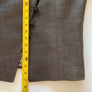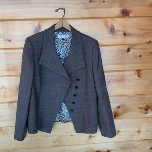 This dark brown and creme tweed wool blazer is stunning with 5 button asymmetrical closure.