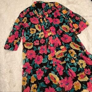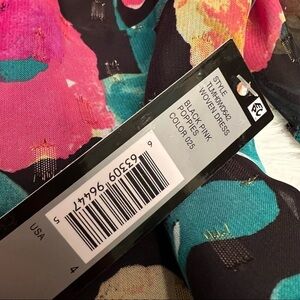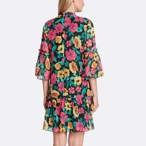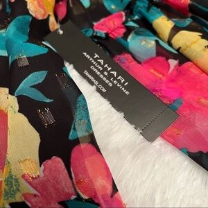TAHARI BLACK PINK GREEN GOLD FLORAL CHIFFON RUFFLE PLEAT BOW DRESS NWT