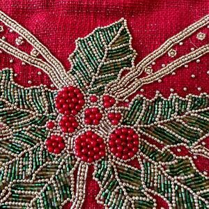 Elevate your holiday table with this TAHARI Christmas Beaded Bow Table Runner. Measuring 16" x 90", this elegant runner features a red, gold and green holly berry design with a stunning beaded bow detail for a festive touch of glam. Crafted from cotton, metallic, and polyester, it’s perfect for Christmas dinners, parties, or seasonal décor. Brand new, beautiful, and imported — the ideal accent to make your holiday table sparkle!