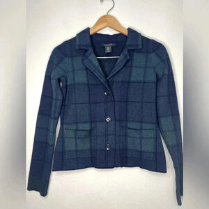 TAHARI Blue and Green Plaid Button Up Sweater / Blazer