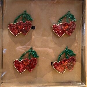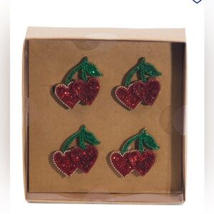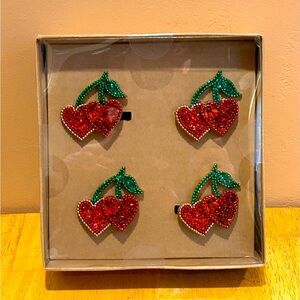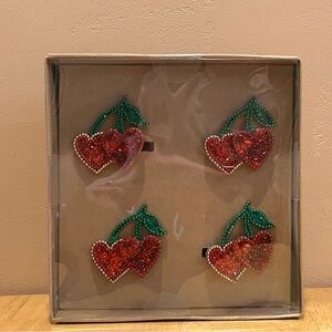 Bring a fun, playful touch to your home with these super cute set of 4 napkin rings made by TAHARI Home. Heart shaped cherries with vibrant cherry red & green colors. Napkin rings are designed with gold toned hardware and beaded design. These are so cute! You look at them and just love them instantly. They bring such a fun ambiance to their surroundings!! Brand new in box.