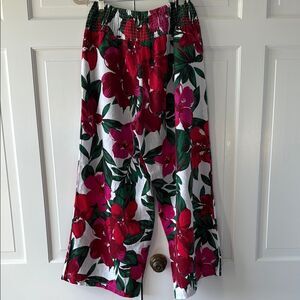 Vibrant floral print wide leg pants featuring large scale floral a mix of red, green, and white. Perfect for a bold, stylish look. Cool natural linen blend. Pre-owned in excellent condition. Pockets! In my opinion, these are a generous fit and could fit a size large.