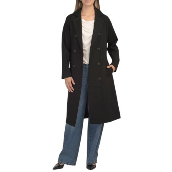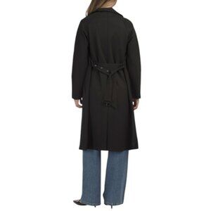 fabric provides stretch, double breasted, 2 front pockets, raglan sleeves, back slit, belt loops, adjustable waist belt