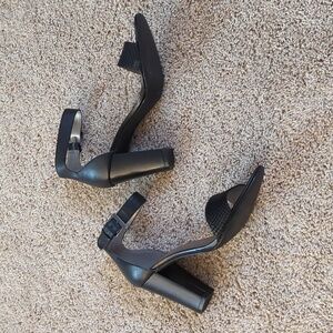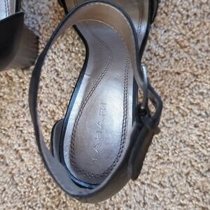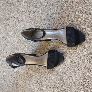 TAHARI May Black Embossed Ankle Strap Chunky Block Heel Sandals
