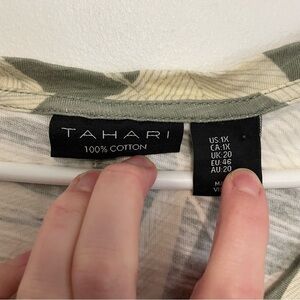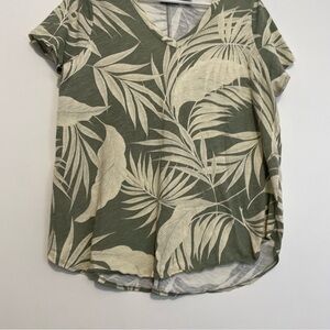TAHARI Plus Size Green Cream Leaf Floral V-Neck Short Sleeve 100% Cotton T-Shirt