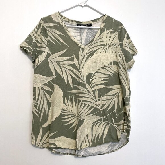 TAHARI Plus Size Green Cream Leaf Floral V-Neck Short Sleeve 100% Cotton T-Shirt