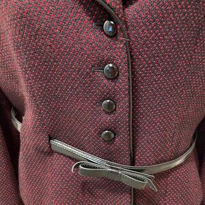 Tahari (by Arthur S. Levine) size 14 skirt suit. Jacket is black with red dots with faux leather trim around edges and on buttons on sleeves and front, and belt. Jacket is wool blend of 51% wool and 49% viscose. Skirt is black with box pleats around bottom of front and back. Invisible zipper with hook and eye closure. Skirt has a crepe like texture. Both jacket and skirt are fully lined in 100% polyester.