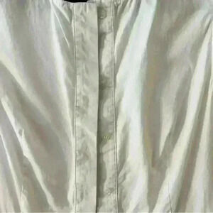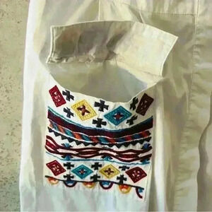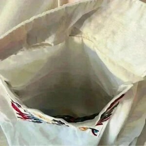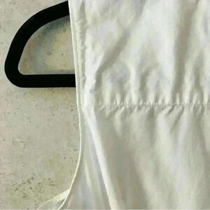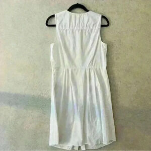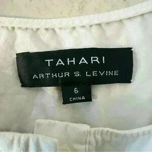 TAHARI WHITE SLEEVLESS DRESS, Knee Length Multicolored Embroidered Pockets. Deep pockets. Dress has buttons all the way down front of dress for closure. Some gathering at the waist line. Size 6.