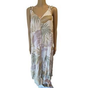 TAHARI SWIM COVER-UP DRESS XL Linen Viscose Tropical Print Braids Strap Sleeves