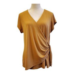 TAHARI SZ XL Faux Wrap Womens Top Camel Brown Short Sleeve V-neck Stretch Blouse