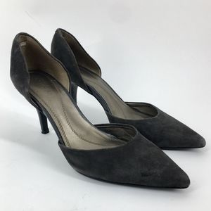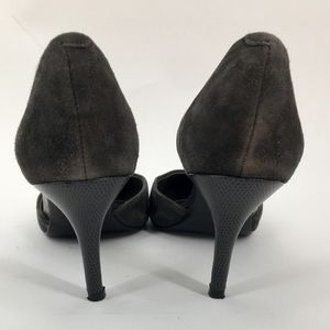 Pictured is a pair of Tahari gray suede leather coco d'orsay pumps. Sexy, stylish, and comfortable. Gently used, please see photos for shoe quality and condition.