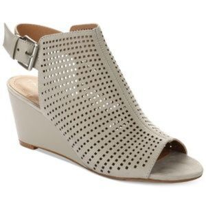 TAHARI TAUPE PERFORATED LASER CUT SYMBA OPEN TOE WEDGE SANDAL 7