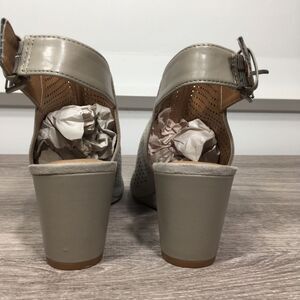 LIKE NEW! TAHARI TAUPE PERFORATED LASER CUT SYMBA OPEN TOE WEDGE SANDAL 7