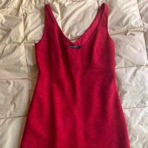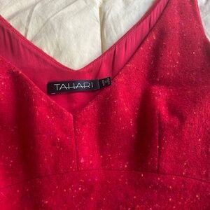 This gorgeous red TAHARI circa 2000 is a beautifully tailored fall cocktail dress in WOOL perfectly lined for comfort with an adorable tiny fur trim! Size small (6) Worn only once or twice and has been under wraps. Smoke free home.