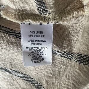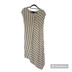 TAHARI Natural Black Linen Blend Striped Abstract Dress, Size S, Striped design, Abstract pattern, Dolman sleeve, V-neck, Midi dress, asymmetrical hem, pull on linen/viscose, Lightweight, Elevate your style with this beautiful midi dress from Tahari. Featuring a stunning striped pattern in white and green, this dress is perfect for any occasion, from travel to workwear. The V-neckline and dolman sleeves add a touch of elegance, while the sleeveless design and linen material keep it comfortable and breathable. The dress is a size small and falls at a midi length, making it perfect for both summer and fall. The linen blend fabric is of high quality and adds a luxurious texture to the outfit. This dress is a must-have for any fashion-conscious woman who wants to make a statement. Excellent Pre owned condition.