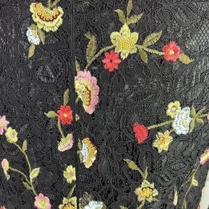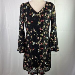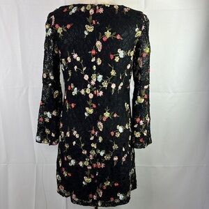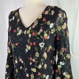 Tahari by ASL Bell Sleeve Dress Size 2. Embroidered shift dress; bright floral pattern accented with gold sequins and beads on black background with 3/4 bell sleeves. Fully lined. Concealed v-center back zipper closure. Approx 17" armpit to armpit, 34" shoulder to hem & 23" sleeves. Embroidery: 100% Polyester. Ground: 100% Nylon. Lining: 94% Polyester & 6% elastane. 🪧K🚌