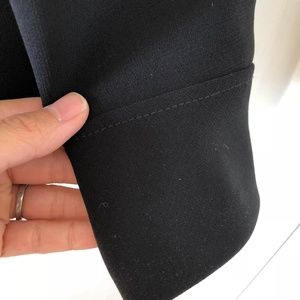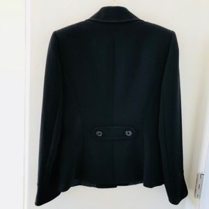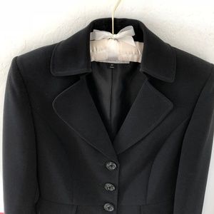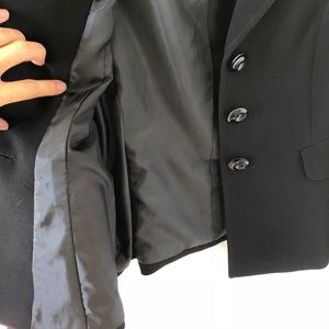 Gorgeous suit that just fits. It hugs & flatters your figure. Detailed stitching throughout with cuff & lapel detail. See pic. Jacket buttons with three unique buttons with an off-center circle and front pocket flaps. Pants is lined. This suit is timeless with its understated elegance.