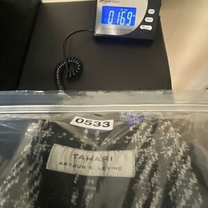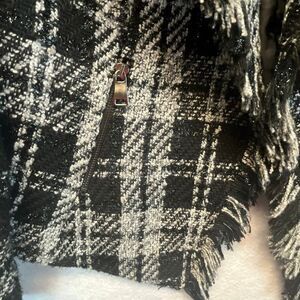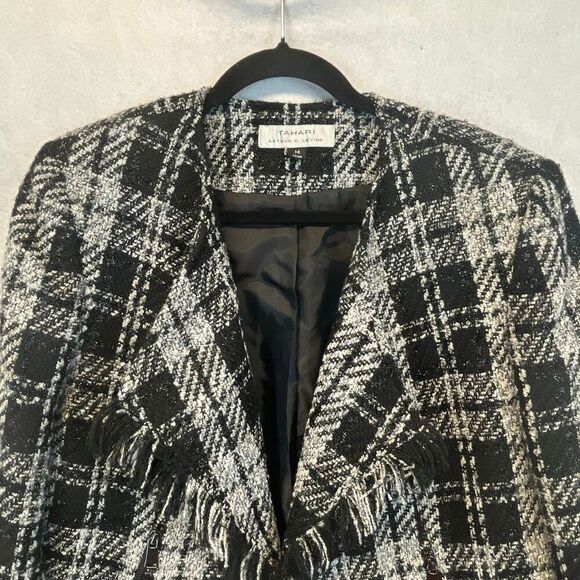 TAHARI Blazer Women’s Size 14 Black White Plaid Tweed Open Front Fringe Cropped