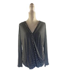 TAHARI LONG SLEEVE SURPLICE STRIPED JERSEY WRAP TOP BLACK WHITE LARGE