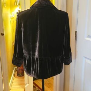 Elegant jacket by Tahari features 4 large snaps down the front for hidden closure. Embroidered cuffs and lapel. Size 8. Rear peplum adds a bit of whimsy. Never worn. Perfect for now and the upcoming holidays.