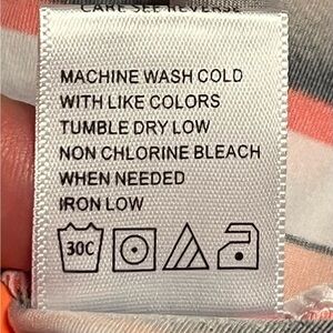 Machine wash cold with like colors, tumble dry low, non-chlorine bleach only, low iron when needed