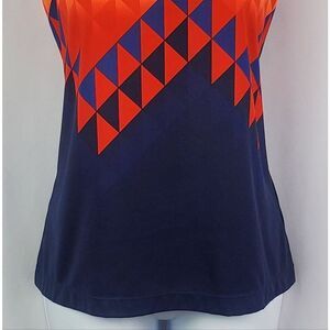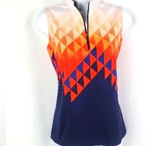 Vibrant sleeveless golf top featuring a striking geometric pattern.