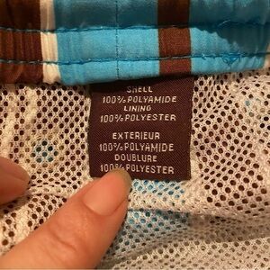 Pre-owned in great condition with no rips or stains. Has normal wear. The velcro on the back pocket has missing threading as shown in picture but still functions well. Men’s blue and brown striped swim trunk shorts. Comes from smoke and pet free home.
