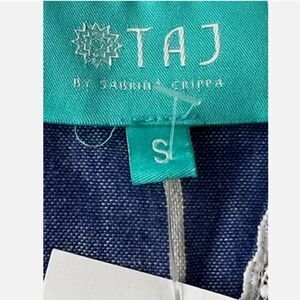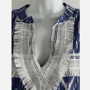 TAJ by Sabrina Top Women’s S Fringed Cotton V-neck Tunic Boho Beach Blue Ikat