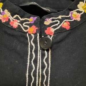 TAKE TWO WOMEN'S SIZE M BLACK FLORAL EMBROIDERED BOHO BUTTON UP JACKET. 100% COTTON. PERFECT FOR A CASUAL DAY OUT or A FORMAL PARTY. LONG SLEEVES or CUFFED. SHORT LENGTH. SMALL STAIN AS SHOWN IN PICTURE. GOOD PRELOVED CONDITION. SHOULDER 18" PIT 21.5" SLEEVE 22" LENGTH 24"