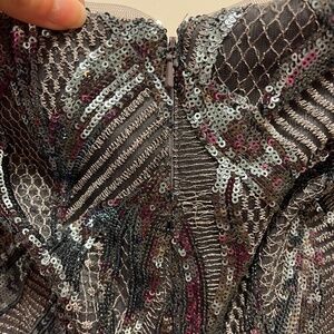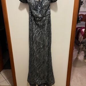 From designer Christina Wu's House of Wu Elegance line of Mother of the Bride dresses. Style #17031. Off the shoulder sequin dress. Dress features inside grips to keep dress in place on the body. Dress has sweep train style. Dress color is gunmetal. Dress has been hemmed for a woman that is 5' 9" wearing flats(or 5' 7" woman wearing 2" heels, so on and so forth). Size 4. Paid $450