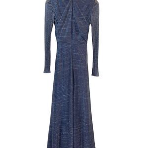 metallic v-neck gown from TALBOT RUNHOF featuring blue, metallic threading, V-neck, ruched bodice, semi-sheer construction, long sleeves and long length.