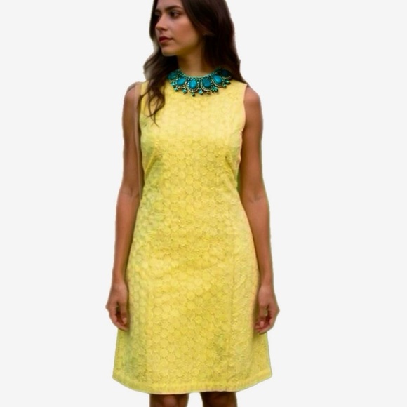 This Talbots dress is made of 100% cotton in a vibrant lemon yellow color, perfect for summer occasions like parties or work events. The sheath style dress features a round neckline, sleeveless design, and eyelet accents and an at the knee hem.